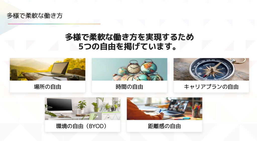 多様で柔軟な働き方を実現するため、「場所の自由」「時間の自由」「キャリアプランの自由」「環境の自由」「距離感の自由」の「5つの自由」を掲げています。